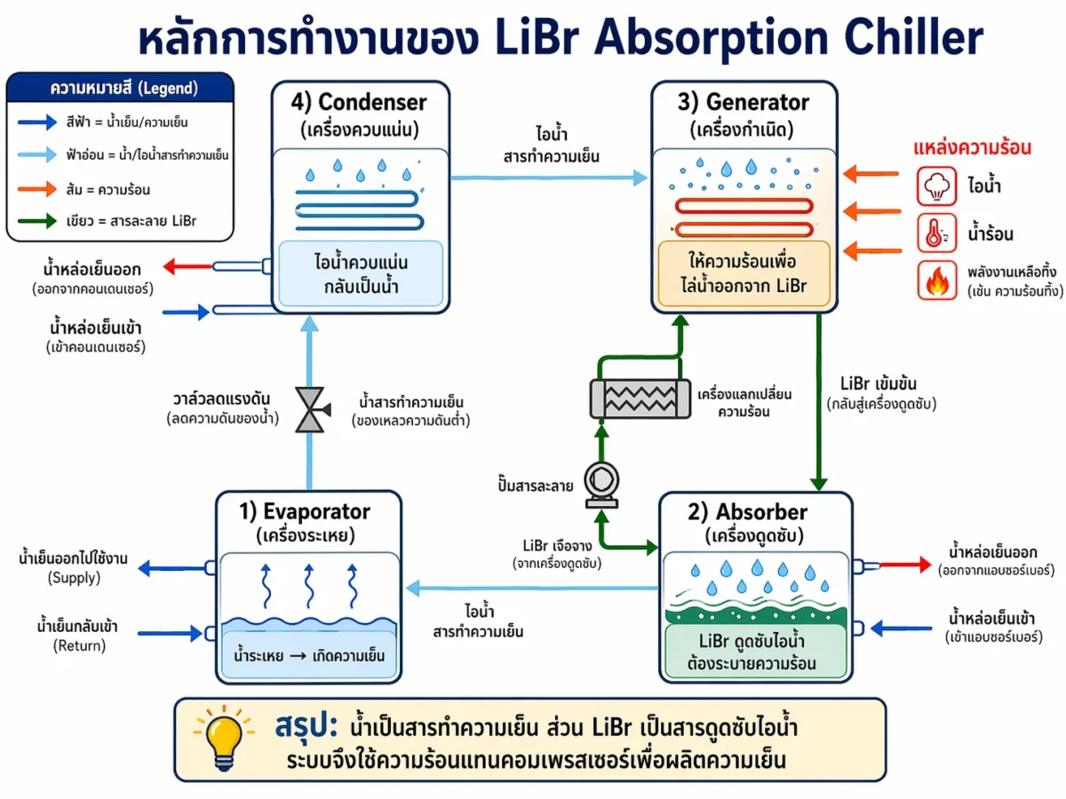 LiBr ใน Absorption Chiller ทำงานโดยอาศัย “ความร้อน” เพื่อสร้างความเย็น ไม่ได้พึ่งคอมเพรสเซอร์แบบเครื่องชิลเลอร์ทั่วไป