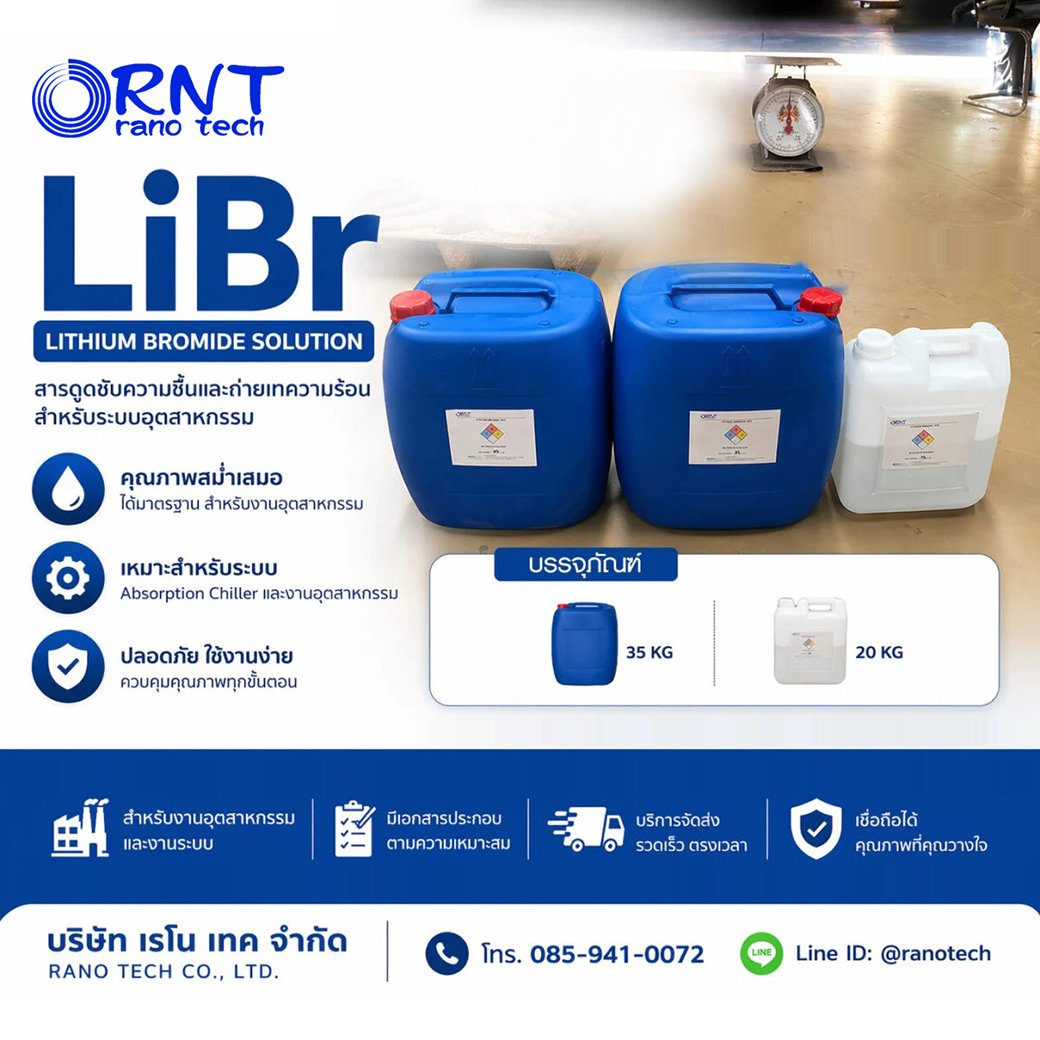 เรโน เทค จัดจำหน่าย Lithium Bromide Solution 55% , Lithium Bromide Powder (ผง ของแข็ง บริสุทธิ์ 99%) , Octyl Alcohol, Lithium Molybdate (Inhibitor ป้องกันสนิมในระบบ)
